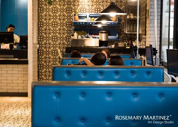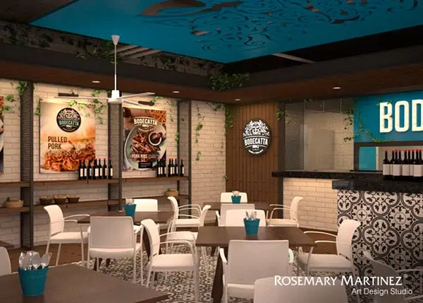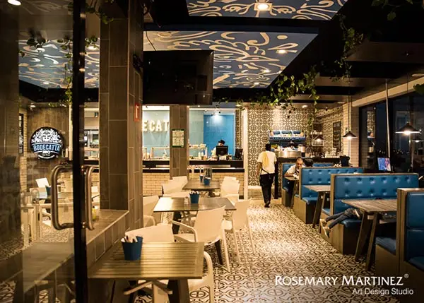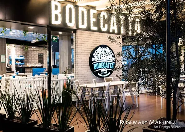 Inspirado en la estética industrial de las bodegas del siglo 19, para lo cual se mezclaron elementos estructurales metálicos negros, maderas rústicas y pisos que recuerdan la pasta artesanal, con acentos de azul puro, inspirados en los trastes de peltre, envuelto en un ambiente de luz cálida que resalta los detalles de interiorismo y gráfica ambiental de Bodecatta.